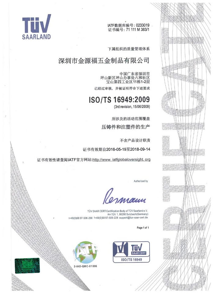 深圳市金源福五金制品有限公司成立于2003年。公司擁有8000多平方米生產(chǎn)廠地、開發(fā)與管理精英人才、技術(shù)專業(yè)、設(shè)備精良、交通便利、服務(wù)周全、具體設(shè)計、開發(fā)、制模、出樣、生產(chǎn)到成品出貨一體化模式生產(chǎn)廠家。已通過ISO9001:2008ISO1440/TS16949:2009國際質(zhì)量體系認(rèn)證。專業(yè)生產(chǎn)鋅合金壓鑄、鋁合金壓鑄產(chǎn)品、汽車配件、汽車后視鏡支架、車載導(dǎo)航散熱器、LED散熱器、LED燈罩、數(shù)碼電子五金結(jié)構(gòu)件、家具五金裝飾件、標(biāo)牌(LOGO)等五金壓鑄產(chǎn)品。